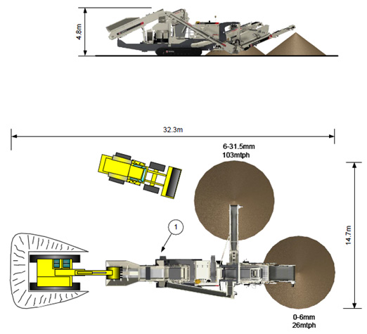 在實(shí)際工況生產(chǎn)環(huán)境中,NFC1000RS所帶的雙層分級(jí)篩可拆卸,尺寸為3.66m×1.52m,可通過機(jī)身再循環(huán)輸送帶將超大物料送回破碎主機(jī)。無需篩分和再破碎的工況下,篩分設(shè)備細(xì)料帶式輸送機(jī)可快速拆卸??蛇x下層篩和可選堆垛帶式輸送機(jī)共同作業(yè)時(shí),可產(chǎn)出另一種規(guī)格的產(chǎn)品。