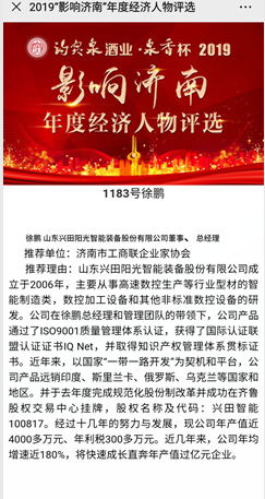 鑒于我公司在科技創(chuàng)新發(fā)展中做出的貢獻,由濟南市工商聯(lián)企業(yè)家協(xié)會推薦,經組委會嚴格審核,我公司總經理徐鵬成功入圍2019“影響濟南”年度經濟人物候選人。
