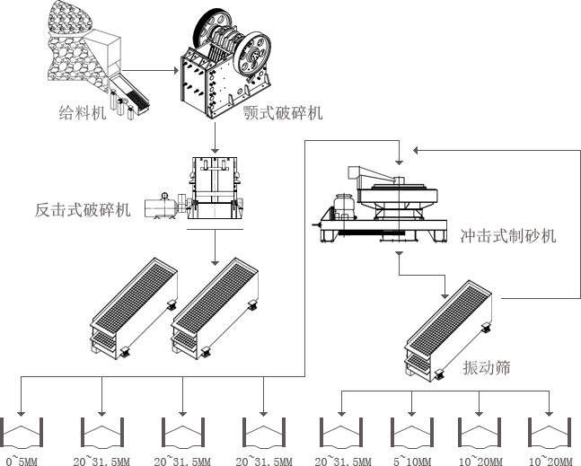 石灰石原料經(jīng)鏟車或自卸車送入原料倉,后經(jīng)振動給料機均勻的將物料喂入鄂式破碎機,將物料破碎至150mm左右大小粒徑,通過皮帶輸送至反擊式破碎機中,破碎至60mm左右大小粒徑,破碎后的物料通過皮帶輸送機送至高效離心沖擊式制砂機中進(jìn)行破碎,破碎后的物料通過振動篩進(jìn)行分級,其中0-5mm和符合成品規(guī)格的物料直接作為成品輸送至成品料堆,不符合成品規(guī)格的物料由皮帶機送至高效離心沖擊式制砂機中次進(jìn)行破碎、篩分,形成閉路循環(huán)。